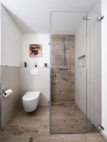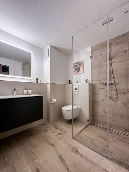 Duschzimmer mit Dusche, Toilette, Waschtisch inkl. Unterbau und Spiegelschrank.